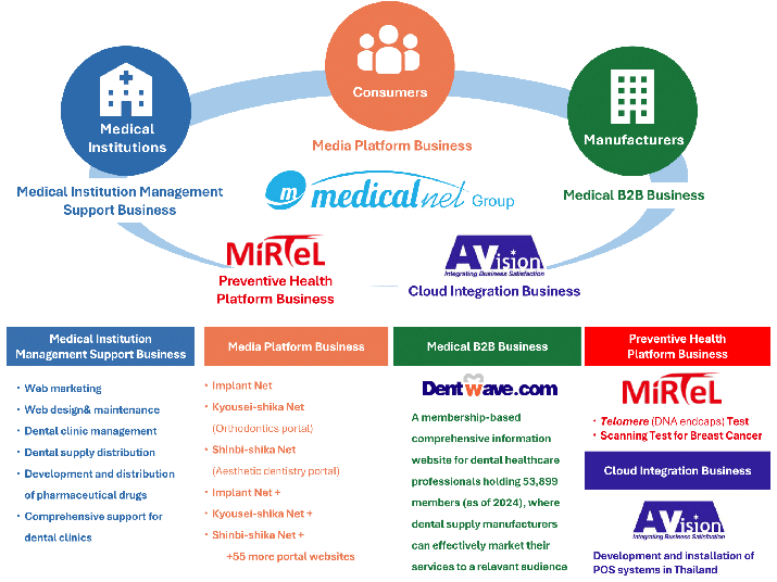 Our primary business is the Media Platform Business. Through the portal website we operate, individuals can find suitable dental clinics tailored to their needs. The platform focuses on treatments not covered by national health insurance, often involving higher costs. Many patients prioritize quality care and are willing to travel for superior treatments. Additionally, the portal offers educational content aimed at alleviating anxiety about dental care. Uniquely, this is the only dedicated dental media platform in the industry, making it an invaluable resource for both patients and medical institutions.
